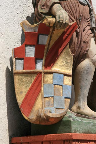 2x Wappen von Baden-Sponheim, Abb. links: Ettlingen, Schildhalterinbrunnen. Das Wappen ist komplett gewendet, weil es das optisch linke von zwei aufeinander bezogenen ist, die beide von der selben Figur gehalten werden. Der Grund des Wendens ist also kompositorische Courtoisie. Abb. rechts: Desgleichen, Ettlingen, Georgsbrunnen, selbes Wappen, ungewendet. Man beachte, daß in beiden Fällen die Sponheimer Farben ausgetauscht sind, was ausdrücklich nicht Bestandteil der Courtoisie ist.
