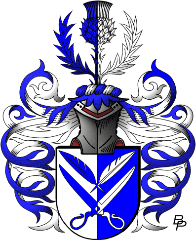 Symbolerklärung: Die Schildfarben stehen für Bayern, die heutige Heimat der Familie des Wappenstifters. Die Schneiderschere symbolisiert den Beruf des Schneidermeisters, den der älteste ermittelte Vorfahre ausübte. Die beiden schräggekreuzten Schwungfedern stehen für den kaufmännischen Beruf des Wappenstifters. Die Eselsdistel (schottische Distel) ist ein Bezug zu seiner Wahlheimat Schottland.