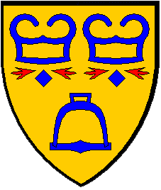 Blasonierung: In Gold oben nebeneinander zwei blaue Feuerstähle, mit den nach unten gekehrten Klingen aus je einem auf der Spitze stehenden blauen Würfel (Stein) je zwei rote Flämmchen schlagend; unten ein blauer Steigbügel, auf dem Helm mit blau-goldenen Decken ein wachsender, goldenbewehrter blauer Bocksrumpf.