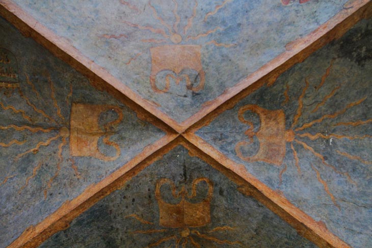 Abb.: Innsbruck, vier gemalte Feuerstähle in den Arkadengewölben des Hauses Herzog-Friedrich-Straße 35 (Stadtrichter Zeller-Haus). Walter Zeller der Ältere wurde 1495 Stadtrichter und ließ diesen Schmuck aufmalen. Das Anwesen war von ca. 1485 bis 1543 im Besitz der Familie Zeller. Besonders markant sind hier die Funken, die unter der Schlagkante der Feuereisen entstehen. Hier sind die Feuereisen vor allem im Zusammenhang mit der übrigen Ausmalung (Quaternionenadler, Habsburgerwappen) ein Hinweis auf den Kaiser.
