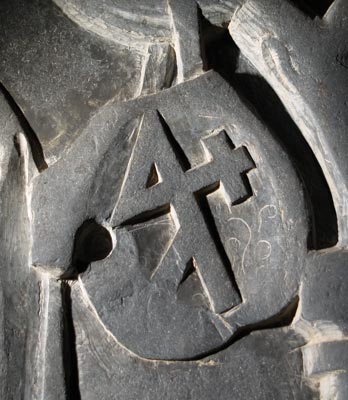 Abb.: Ein weiteres Beispiel für Hausmarken in der Heraldik: St. Katharinenkirche zu Oppenheim, Stein für Johannes Glan, Bürgermeister in Oppenheim, gest. 1500 AD, mit einer inverssymmetrischen Hausmarke aus einem schrägrechten Schaft mit Kopfkreuz- und Fußkreuzsprosse, einem schräglinken Schaft mit hinterer Oberkopfabstrebe und vorderer Fußstrebe sowie einer Mittelkreuzsprosse auf dem Kreuzungspunkt beider Schäfte.