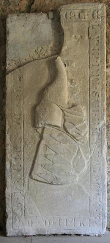 Die obige Abbildung zeigt einen sehr alten Grabstein auf der Comburg bei Schwäbisch Hall. Hier beträgt die Neigung des Schildes mit den fünf Rauten sogar ca. 70-75 Grad! Dieses ist sicherlich ein Extrembeispiel, zeigt aber, daß es bei sehr alten Wappendarstellungen kein wirkliches Limit gibt.