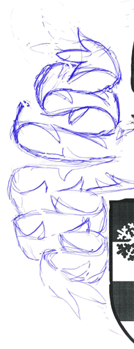 Dann greift man sich in Schritt 1 (Abb. oben) ein paar Papier-Ausdrucke des zentralen Korpus und skizziert mögliche Decken. Das muß weder schön sein noch richtig, es geht allein um Wahrnehmung von Platz und Ausdehnung, von Richtungen und Möglichkeiten. Schnell merkt man, welches Konzept Synergien ergibt, was paßt und was nicht. Natürlich hat die Erstskizze keine idealen Proportionen. Es handelt sich mehr um eine Idee, die nun angepaßt wird. Im Beispiel entscheiden wir uns für das Konzept ganz rechts auf dem Schmierpapier. Denn weil Schneekristalle hexagonaler Symmetrie das Schildbild dominieren, soll der Gesamtumriß des Wappens auch das Sechseckmotiv dezent aufgreifen, und die horizontalen Lagen korrespondieren mit den horizontalen Teilungen. Man sieht aber auch schon, daß diese Skizze in der hingeschmierten Größe keinesfalls auf die andere Seite paßt, ohne mit dem Arm zu kollidieren - hier ist großer Optimierungsbedarf.