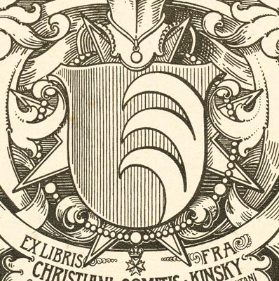 Abb.: Detail aus einem historischen heraldischen Exlibris, entworfen von Ernst Krahl (1858-1926) für Christian Graf von Kinsky (Exlibris von 1903). Auch dieses Wappen wird unterlegt von einem achtspitzigen Malteserkreuz und umrahmt von Kette mit Kreuz. Graf Kinsky war Kommendator des Ordens vom Spital des heiligen Johannes zu Jerusalem, Ordo Hospitalis Sancti Johannis Hierosolymitani, wie die zugehörige Inschrift besagt.
