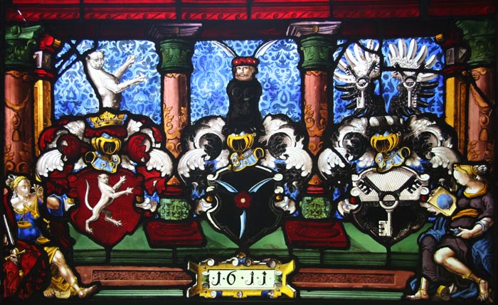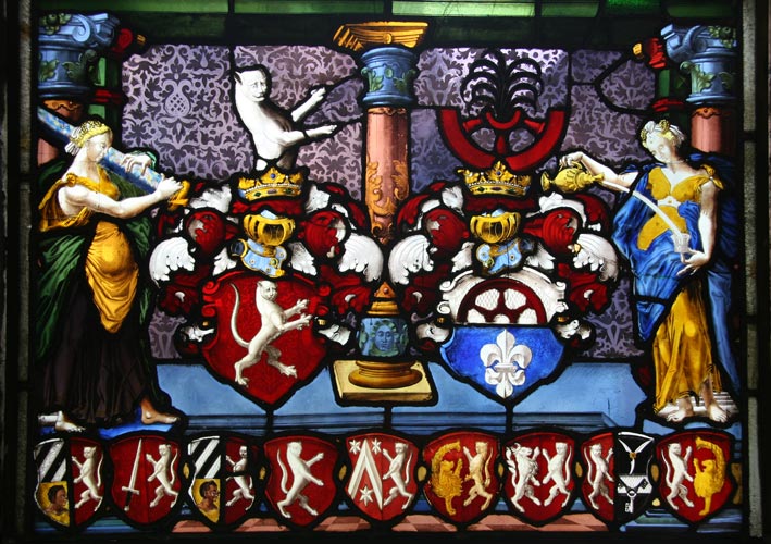 Dies soll an einem Beispiel gezeigt werden, an den Glasfenstern der Herrschaftsempore der Bartholomäuskirche in Kirchensittenbach (Landkreis Nürnberg). Drei Glasfenster vom Beginn des 17. Jh. bilden die vollständige Genealogie zweier Generationen ab, ganz ohne Worte, nur durch nach bestimmten Regeln kombinierte Wappensymbole.