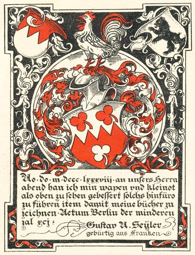 Der Text unter dem Wappen lautet: "A(nn)o do(mini) m dccc lxxxviii an unsers Herrn / abend han ich min wapen und kleinot / als oben zu sehen gebessert solchs hinfüro / zu führen item damit meine bücher zu / zeichnen Actum Berlin der minderen / zal xci, Gustav A. Seyler / gebürtig aus Franken." Es gibt noch ein zweites Exlibris für diesen Eigner vom gleichen Künstler, ganz ähnlich mit ähnlichem Text (siehe Sammlung 79).