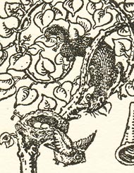 Die Aussparung in dem gemauerten Sockel bietet Platz für das Familienwappen Ebel, gemäß der Schraffur in Gold ein mit drei goldenen, sechsstrahligen Sternen belegter, schwarzer Schrägbalken, außen beiderseits mit je einem roten, dreiblättrigen Kleeblatt besteckt. Auf dem bewulsteten Helm drei Straußenfedern. (Bildquelle: Clemens Kissel, 25 Bücherzeichen, entworfen und ausgeführt von Clemens Kissel zu Mainz, J. A. Stargardt Verlag, Berlin 1894.)