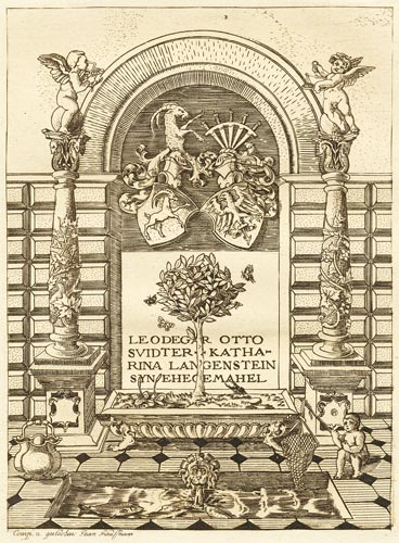 Die Familie Suidter, der das gewendete Wappen auf der heraldisch rechten Seite zugeordnet werden kann, ist eine Luzerner Familie, die ehemals von Buchrain stammt. Das Wappen wird wie folgt angegeben: In Blau ein aufgerichteter, rotgezungter schwarzer Steinbock, auf dem Helm mit schwarz-blauen Decken der Steinbock wachsend (Wappen der Bürger von Luzern 1798-1924, von A. am Rhyn, 1934). Auch die Familie Langenstein seiner Ehefrau ist eine Luzerner Familie, die aber eigentlich ehemals von Oberkirch und Immensee kommt, ihr Wappen wird in der selben Quelle beschrieben: In Silber ein blau bewehrter roter Adler, die Schwanzfedern von einem blauen Dreiberg überdeckt, auf dem rot-blau bewulsteten Helm mit rot-blauen Decken fächerweise fünf gestürzte, silberne, goldengegriffte Schwerter. Beide Wappen sind mit dieser Tingierung ein klarer Verstoß gegen die üblichen heraldischen Tingierungsgepflogenheiten. Leodegar Otto Suidter (3.5.1833-7.2.1901), war Apotheker in Luzern, dazu langjähriger Präsident der Naturforschenden Gesellschaft in Luzern, und Großrat 1877. Seine Apotheke (Bahnhofstraße 21, CH-6003 Luzern) wurde 1833 von Dr. med. Leopold Suidter (1803-1855) eröffnet und ist damit die älteste bestehende Apotheke der Stadt Luzern, die viele Jahrzehnte ein dynastisch geführter Familienbetrieb war. Leodegar Otto Suidter selbst übernahm sie 1855 nach dem Tod des Vaters und führte sie bis zu seinem eigenen Tod. Sein Sohn Otto Suidter junior (1866-1936) übernahm 1901. Diese Apotheke gibt es immer noch, derzeitiger Inhaber ist Dr. pharm. Matteo Schaffhauser.
