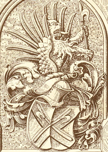 auf dem Stechhelm des Wappens, sein Blick geht zur