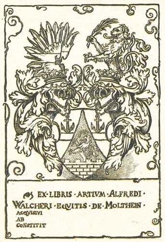 Das Wappen zeigt eine eingebogene Spitze, Feld 1 und 2: in Rot ein silberner Wellenbalken, darüber ein eiserner Anker, Feld 3: in Silber ein aus einer roten Zinnenmauer wachsender doppelschwänziger roter Löwe, der in der rechten Pranke einen grünen Palmzweig hält. Zwei gekrönte Helme, beide mit rot-silbernen Decken, Helm 1 (rechts): ein rechts roter und links silberner Flug, beiderseits mit einem Wellenbalken in Gegenfarbe belegt, Helm 2 (links): ein wachsender doppelschwänziger roter Löwe, der in der rechten Pranke einen grünen Palmzweig hält. Die Familie Walcher Ritter von Molthein war einst ein Kupferschmiedgeschlecht aus Absam in Tirol, das in einem Zweig über Moldautein in Böhmen nach Wien kam. Johann Georg Walcher (5.1.1785-19.12.1854), Oberbuchhalter der k. k. privil. Österreichischen Nationalbank, bekam am 17.11.1854 per Diplom den österreichischen Adelstand mit dem Prädikat "von Molthein" verliehen. Dessen einziger Sohn Leopold Walcher von Molthein, k. k. Ministerialrat und General-Konsul in Palermo, bekam am 10.10.1873 per Diplom den österreichischen Ritterstand verliehen. Das hier wiedergegebene Wappen entspricht dem des Diplomes von 1873.
