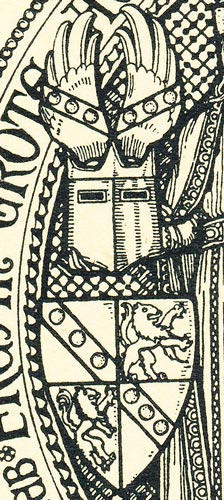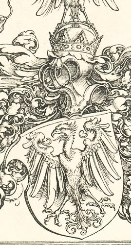 Das Wappen zeigt jeweils einen Adler im Schild und als Kleinod. Der Adler ist beidemal rot, das Feld golden, die Helmdecken entsprechend rot-golden. Aussagekräftiger für seine Position sind die kleinen Details: Nicht nur führt er einen Bügelhelm, sondern dieser ist als besonderes Gnadenzeichen mit einer Erzherzogskrone mit den typisch dreieckigen Zacken auf dem Stirnreif bedeckt. Dieses Detail zeigt, daß die Führung einer solchen Komposition nur einem besonderen Gunstbeweis des Kaisers zu verdanken ist, der nicht vor 1508 erfolgt ist, denn in der Inschrift des zweiten hier vorgestellten Blattes (s. u.) geht hervor, daß es a) eine Verleihung war und b) Maximilian bereits Kaiser war. Mit dieser Gunst wurde also eine mindestens 7jährige Tätigkeit in den beschriebenen Positionen bei Hofe honoriert. Das hier als Wappentier der Adler zum Einsatz kam, wenn auch in anderer Farbe als beim Adler der Könige, ist ebenfalls ein Zeichen für die besondere Bindung des Begünstigten an seinen Landesherrn und das Ausmaß der Ehre, die dieser ihm zuteil werden läßt. Das Wappen wird beschrieben im Siebmacher Band: Bg9 Seite: 29 Tafel: 36; dort wird der Erzherzogshut jedoch fälschlicherweise als Kaiserkrone bezeichnet, was nicht zutrifft; außerdem ist die Verleihung deutlich vor das dort angegebene Jahr 1521 zu datieren.