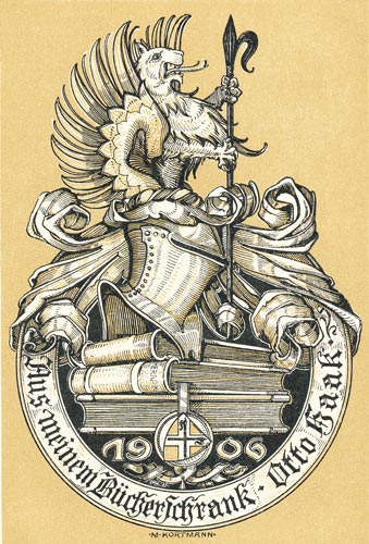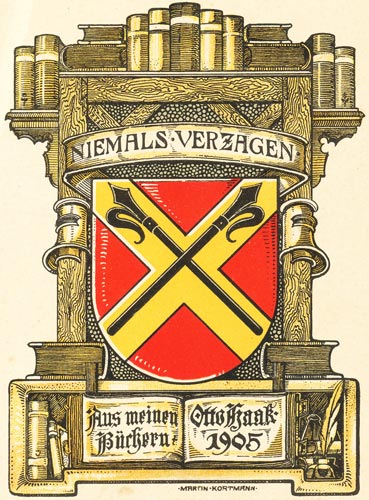 Das oben abgebildete Blatt ist technisch die feinste von Martin Kortmann für Otto Haak angefertigte Arbeit. Es ist zugleich die eigenwilligste Arbeit, denn Schild und Oberwappen sind nicht nur räumlich, sondern auch maßstabsmäßig weit voneinander getrennt. Primär nimmt der Betrachter die linksgewendete Helmzier wahr. Der eigentliche Wappenschild jedoch befindet sich auf einem Anhängsel eines aus dem mittleren Buch heraushängenden Lesezeichens, zentral zwischen den Ziffernpaaren der Jahreszahl 1906. Das zu drei Fünftel sichtbare Band mit der Aufschrift "Aus meinem Bücherschrank - Otto Haak" umgibt kreisförmig den Stapel von drei ledergebundenen Büchern, auf denen der Helm mit seinem Kleinod abgelegt ist. Die Helmdecke verdeckt den oberen Teil des Schriftbandes und ist mit ihren Ausläufern um dasselbe geschlungen. Die eingedruckte Künstlersignatur befindet sich ganz unten außerhalb der kreisförmigen Begrenzungslinie.