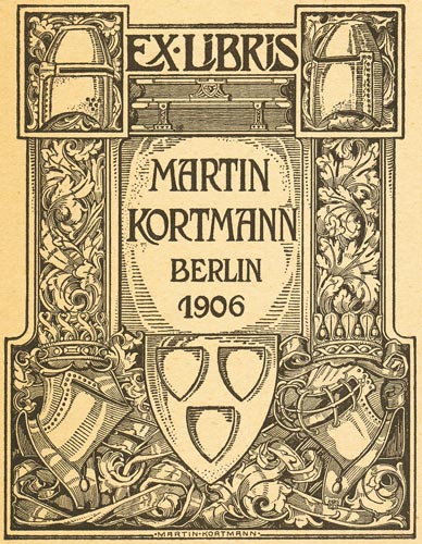Diese beiden Blätter (Farblithographien, links 12.4 x 9.3 cm, Sujet 11 x 7.7 cm, rechts 12.5 x 8.7 cm, Sujet 10.8 x 7.3 cm) sind sehr ähnlich, weil sie jeweils nur den Wappenschild zeigen ohne Oberwappen, weil sie beide nur diesen Schild in kräftigen heraldischen Farben wiedergeben, während der Rest unauffällig schwarz mit bräunlicher Flächenfarbe gehalten ist und weil sie beide als Hintergrund ein Bücherregal gewählt haben. Dazu stammen sie beide aus dem Jahr 1905. Nur das linke trägt die Devise "Niemals verzagen" auf einem Schriftband. Das links abgebildete Blatt benutzt ein aufgeschlagenes Buch als Träger der Eignerzuweisung, das rechts abgebildete Blatt ein Pergament mit fünf abhängenden Siegeln, wobei die Zeile "Aus meinen Büchern" hochgesetzt ist auf einem oben abgerundetem Panneau. In beiden Blättern tauchen die typischen Kontor- und Bibliotheks-Accessoires auf wie Feder und Tintenfaß. Im rechten Blatt sind seitlich des Schildes Eichenzweige zu erkennen. Dazu sieht man zwei Kerzenständer. Die Komposition mit den Interieur- und Ameublement-Elementen aus verschiedenen Holzformen ist deutlich vom Historismus inspiriert.
