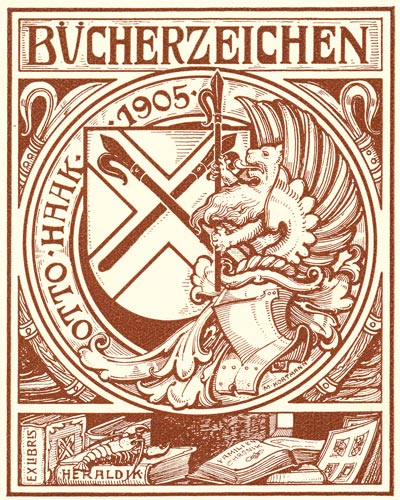 Dieses weitere Blatt für Otto Haak ist auf 1910 datiert. Die Komposition mit dem zuvor beschriebenen Haak-Wappen ist kreisförmig mit umlaufenden Schriftband, das neben der Datierung und der Eignernennung noch die Devise "niemals verzagen" enthält. Das Blatt ist ein schwarz-weißer Druck mit ganz feiner Rasterung (Gesamtgröße 11 x 11 cm, das Sujet hat einen Durchmesser von 9.4 cm). Die Komposition greift darstellerisch die Art einer runden Wappenfensterscheibe auf. Zwei zwischen Helmdecken und Kleinod eingepaßte Einzelschilde zeigen die Stadtwappen von Hamburg und Berlin, wichtigen Lebensstationen des Eigners.