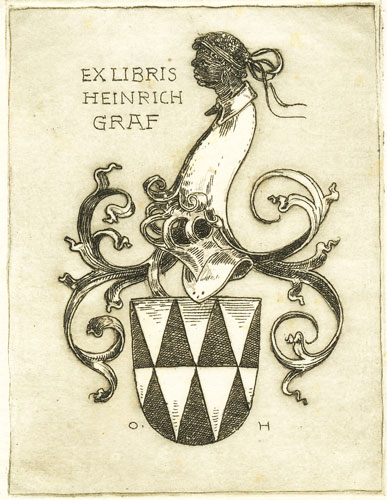 rechts unten im Druck monogrammierte Exlibris von Otto Hupp