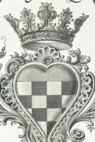 rechts monogrammiert ist. Das frontal dargestellte Vollwappen der