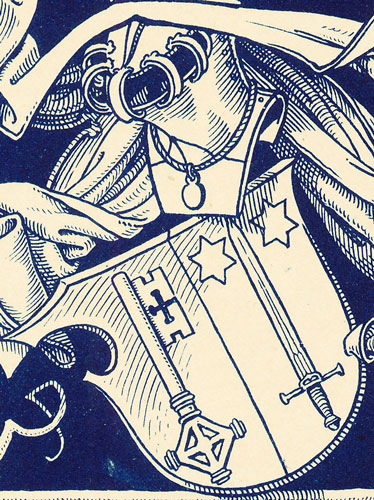 ein darauf gelegter Säbel unter dem Wappenschild. Das Wappen ist