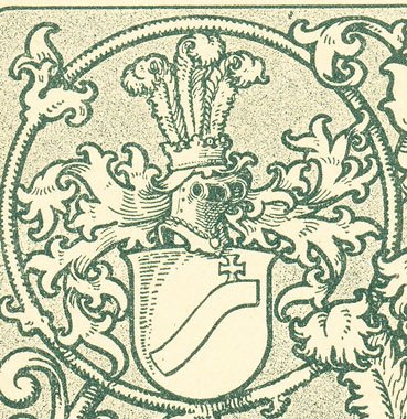 das Vollwappen im Oval umlaufende Inschrift weist das Blatt