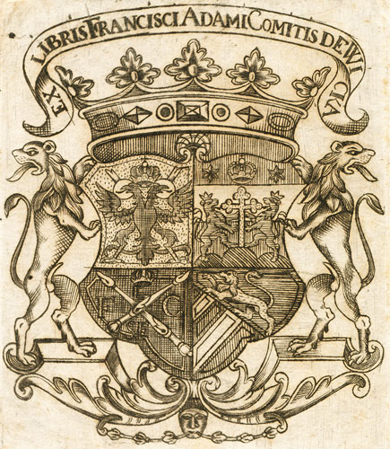 Das Blatt im Rokokostil wird unten im Schriftfeld als "Ex libris Joannis Wenceslai L(iberi) B(aronis) à Widman(n)" bezeichnet. Johann Wenzeslaus Freiherr von Widmann, Sohn von Johann Anton Ritter von Widmann und Lucia Maria Gögger von Löwenegg. Er stand erst in kaiserlichen militärischen Diensten, wurde 1741/1742 General-Landeskriegscommissar während der kriegerischen Auseinandersetzung mit Preußen, und 1744 wurde er Mitglied des Generalcommissariates bei der Errichtung der Landmiliz. Nach dem Krieg wurde er Staatsmann und wechselte in die Justizverwaltung. 1748 wurde er Assessor bei der k. k. mährischen Deputation für Contributions-, Cameral- und Militärangelegenheiten, dann k. k. und k. böhmischer und ungarischer bevollmächtigter Minister im fränkischen Kreise, bis 1763. Zeitweise war er österreichischer Gesandter am bayerischen Hof in München. Kaiserin Maria Theresia ernannte ihn am 9.8.1766 zum königlichen Oberstlandrichter in Mähren, und in diesem Amt finden wir ihn bis 1772. Seine Lebensdaten sind nicht bekannt, geboren ist er vermutlich im ersten Jahrzehnt des 18. Jh., und 1772 dürfte auch seinem Todesjahr entsprechen.