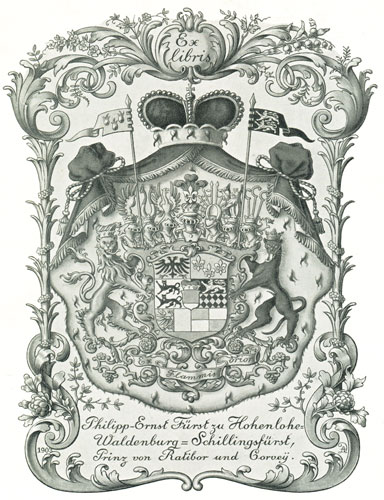 Ratibor war eigentlich eine Herrschaft, die der Kurprinz von Hessen-Kassel 1812 erwarb. Zum Ausgleich für an Frankreich verlorene linksrheinische Territorien, eine Spätfolge des Wiener Kongresses, wurde Landgraf Viktor Amadeus von Hessen-Rotenburg (-12.11.1834) mit dem 1820 zum Mediatfürstentum erhobenen Ratibor und mit dem Mediatfürstentum Corvey ausgestattet. Er war selbst ohne Kinder und machte am 9.11.1825 seinen Neffen testamentarisch zu seinem Erben von Ratibor und Corvey. Seine Landgrafschaft Hessen-Rotenburg fiel mit seinem Tod zurück an das kurfürstliche Haus in Kassel. Sein Neffe Victor I. zu Hohenlohe-Schillingsfürst (18.2.1818-1893) folgte ihm 1834 nach, so kamen die Hohenloher an den Titel. Da der Erbe erst 1840 volljährig wurde, beginnt seine Regierungszeit als Herzog von Ratibor erst dann. Es gibt auch noch eine alternative Anordnung der Felder: Hauptschild gespalten aus Ratibor und Corvey, Mittelschild aus den Feldern 1, 2, 3, 4 und dem Regalien-Schildfuß, Herzschild wie zuvor. Diese Variante wird von den Herzögen von Ratibor aus der Linie Hohenlohe-Schillingsfürst benutzt, deren erster Victor I. zu Hohenlohe-Schillingsfürst (1818-1893), 1840-1893 Herzog von Ratibor und Fürst von Corvey wurde, welcher auf das Fürstentum Schillingsfürst verzichtete. 1945 mußte die Familie aus Ratibor fliehen und zog nach Corvey. Die schlesischen Besitzungen fielen an Polen. Danach lebte die Familie zeitweise in Niederösterreich, verlegte aber 2009 wieder den Wohnsitz nach Corvey. Bei dem Exlibriseigner handelt es sich hingegen um die zu Schillingsfürst verbliebenen Hohenloher, die aber dennoch den Titel eines Prinzen von Ratibor annahmen. Der Unterschied wird im Wappen dadurch gezeigt, daß die beiden neu aufgenommenen Felder für Ratibor und Corvey nicht als eigener Hauptschild, sondern nur als Feld 5 und 6 plaziert werden.