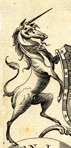 Die heraldisch linke Seite ist die der Ehefrau, und hier sehen wir das Wappen der Dalrymple, Earls of Stair, in Gold ein blaues Schragenkreuz, welches mit neun (2:2:1:2:2) goldenen Rauten belegt ist. Englischer Blason: Or on a saltire Azure nine lozenges of the field (Dalrymple). Das Wappen der Hamilton-Dalrymple wurde auch noch wesentlich komplexer geführt: Quarterly: 1st grandquarter: Or on a saltire Azure nine lozenges of the field (Dalrymple), 2nd grandquarter: Or a chevron chequy Sable and Argent between three water bougets of the second (Ross), 3rd grandquarter: quarterly: 1st and 4th counterquartered: 1st and 4th: Gules three cinquefoils Ermine, 2nd and 3rd: Argent a galley sails furled Sable, the whole within a bordure compony Argent and Azure, the first charged with hearts Gules and the second with mullets Argent (Hamilton of Bargany), 2nd and 3rd: Gules on a fess between three crescents Or as many mullets Azure (de Franquetot), 4th grandquarter: quarterly: 1st and 4th: Gules on a chevron between three cinquefoils Argent as many round buckles Azure (Hamilton of Fala), 2nd and 3rd: Gules three martlets Argent (Makgill). Crest: a rock Proper. Supporters: on either side a stork holding in its beak a fish all Proper. Hier beim Bucheignerzeichen hat man sich auf das einfache Wappen Dalrymple beschränkt.