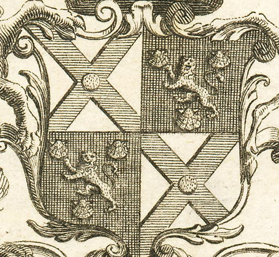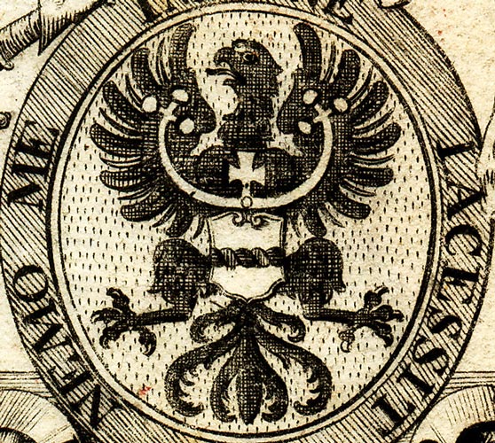 Daneben gibt es noch weitere Elemente: Seit er seinem Vater als 3rd Earl nachfolgte, durfte er die Earlskrone führen. Für die Aushandlung des Breslauer Friedens (der als Präliminarfrieden den Ersten Schlesischen Krieg zwischen Preußen und Österreich beendete und am 28.7.1742 im Frieden von Berlin bestätigt wurde), den er für den Wiener Hof unterzeichnete, bekam er mit einem entsprechenden Diplom von König Friedrich dem Großen die Erlaubnis, seinem Familienwappen den Schlesischen Adler (andere Quellen: preußischer Adler) hinzuzufügen aufgrund des Bezuges zum Breslauer Frieden, was von Maria Theresia bestätigt wurde. Das ist es, was wir hier sehen, in Gold ein schwarzer Adler, der auf der Brust mit silbernen Kleestengeln belegt ist, aus dessen Höhlung ein silbernes Tatzenkreuzchen wächst, und das eigentliche Familienwappen wurde nur noch als Brustschild aufgelegt. Von seinem eigenen König erhielt der Earl of Hyndford für seine Verdienste die Aufnahme in den Distelorden. Um das schlesische Wappen ist ein Schriftband gelegt mit der Devise "NEMO ME IMPUNE LACESSIT" - niemand reizt mich ungestraft - das ist der Wahlspruch der schottischen Stuart-Könige und die Devise des Most Ancient and Most Noble Order of the Thistle. Dazu gehört auch als abhängendes Ordenszeichen ein Bild des heiligen Andreas im Kirchenornat, der ein silbernes Andreaskreuz vor sich hält und von goldenen Strahlen umgeben ist. Aufgrund dieses Distelordens läßt sich ebenfalls das Exlibris eindeutig dem 3rd Earl zuordnen, denn er war der einzige der vielen John Carmichaels, der Mitglied war.