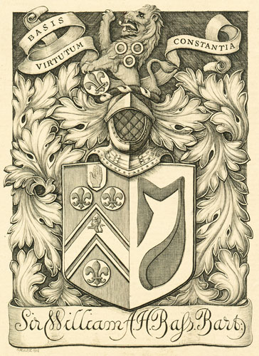 William (Billy) Arthur Hamar Bass entstammte einer durch Brauerei wohlhabend gewordenen Familie, der die 1777 gegründete Bass Brewery in Burton-upon-Trent gehörte. Er besuchte die Harrow School in Harrow, London, und danach das Trinity College in Cambridge. Er brach ab und ging zum Militär; er kämpfte u. a. in Südafrika im Burenkrieg. 1902 kehrte er zurück, um bald darauf zu heiraten und sich den angenehmen Seiten des Lebens zu widmen, allem voran dem Pferderennsport (er besaß einen eigenen Rennstall mit den siegreichen Pferden Sceptre, Rosedrop und Cyllene) und den frühen Kinoproduktionen. William Arthur Hamar Bass war Justice of the Peace in Staffordshire, wo er Byrkley Lodge in Burton-on-Trent besaß. Der Titel eines Bass Baronets wurde am 17.5.1882 geschaffen und erlosch 1952 mit dem Exlibriseigner; es gab also nur zwei Träger dieses Titels. William Bass hatte nur noch eine Schwester, Sibell Lucia Bass, vermählt mit Berkeley John Talbot Levett. Der Neffe von Williams Ehefrau nahm daraufhin den Namen Bass zusätzlich an und wurde 1954 zu Captain Peter Robin Hood Hastings-Bass (16.7.1920-4.6.1964). Dessen Sohn William Edward Robin Hood Hastings-Bass wurde später der 17th und gegenwärtige Earl of Huntingdon.