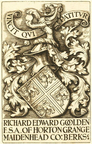 Richard Cyril Lockett, Esq., J. P., F.S.A., wurde 1873 geboren. Er war der Sohn von Richard Robertson Lockett (1846-1905) und Isabella Maria Paterson of Magherafelt, co. Derry. Er heiratete 1906 Beatrice Bell. Die beiden hatten drei Kinder, Richard Jeffrey Lockett (1907-), Gerald Derek Lockett (1909-) und Sheila Beatrice Lockett. Der Exlibriseigner ist bekannt geworden als Sammler vornehmlich griechischer Münzen (Lockett Collection, 1955-1961 versteigert, ein Teil im British Museum). Er starb 1950. Eve hat für denselben Eigner ebenfalls 1908 noch ein wesentlich größeres Blatt gestaltet, auf dem das Wappen vollständig zu sehen ist.