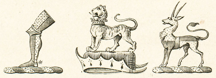 Über dem Wappenschild sind drei Kleinode zu sehen, in der Mitte auf einem roten, mit Hermelin aufgeschlagenen Turnierhut ein stehender silberner Tiger mit goldener Halskrone (on a chapeau Gules turned up Ermine a tiger statant Argent ducally gorged Or), rechts auf einem golden-schwarzen Wulst ein golden-schwarz geviertes, gerüstetes und gesporntes Bein (a jamb armed and spurred quarterly Or and Sable), und schließlich links auf einem golden-schwarzen Wulst eine golden-schwarz gevierte Antilope, eigentlich ein Fabelwesen namens Calopus (a calopus or chatloup, quarterly Or and Sable, afterwards blazoned as an antelope). Unter dem Wappenschild befindet sich das Schriftband mit der Devise "SOYEZ FERME" - seid standhaft. Der mittlere Teil des Schriftbandes ist mit einem Abzeichen (Badge) belegt, aus einer silbernen liegenden Mondsichel hervorkommend ein naturfarbener Eichenbruch (a sprig of oak fructed Proper and a crescent Argent).
