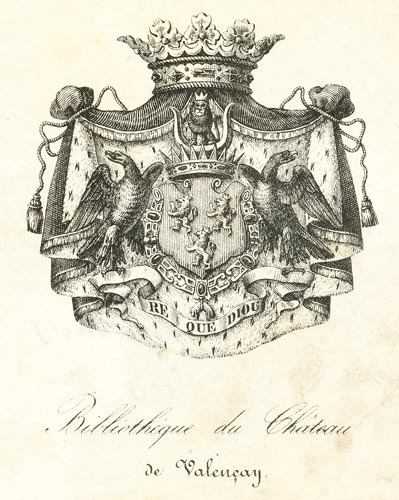 1803 kaufte Talleyrand das Schloß Valençay, einst erbaut von Jacques d'Estampes im Stile der Renaissance, später barock erweitert, für dessen Schloßbibliothek dieses Exlibris von unbekannter Hand als Stahlstich gefertigt wurde. Talleyrand ließ das Innere seines Landschlosses komplett im Empirestil umgestalten. Auf dem Exlibris ist er als Ritter des Ordens vom goldenen Vlies gekennzeichnet, diese Ehrung wurde ihm 1814 zuteil. Als Zeitrahmen sind daher die Jahre während der Restauration anzusetzen, was auch dem Stil der Wappendarstellung entspricht, denn in napoleonischer Zeit als Fürst von Benevent 1806-1815 hatte er unter einem blauen Schildhaupt mit einem goldenen, auf einem ebensolchen Donnerkeil sitzenden napoleonischen Adler (typisches Schildhaupt des napoleonischen Systems) einen gespaltenen Schild, rechts Stammwappen Talleyrand-Périgord, in Rot drei (2:1) goldene, blau gezungte, bewehrte und ebenso gekrönte Löwen, links in Gold ein schwarzer Eber mit Schabracke (Benevent), vgl. Siebmacher Band: FstC Seite: 261 Tafel: 369. Der entsprechende französische Blason lautet: Parti, au 1 de gueules aux trois lions d'or armés, lampassés et couronnés d'azur, au 2 d'or au sanglier passant de sable chargé sur le dos d'une housse d'argent, au chef des princes souverains d'Empire brochant sur la partition. Hier auf dem Exlibris entspricht die Darstellung eher seinem Wappen als Herzog von Dino (vgl. Siebmacher Band: FstB Seite: 49 Tafel: 87). Wappenmantel (üblicherweise blau und hermelingefüttert) und Krone entsprechen dem eines französischen Pairs. Für eine noch opulentere Darstellung eines Talleyrand-Wappens mit Löwen als Schildhaltern vgl. Siebmacher Band: FstC Seite: 261 Tafel: 370.