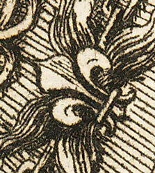 Der Hintergrund enthält eingestreut zwei verschiedene Embleme, einmal zwei spiegelbildliche, ineinander verschränkte "D", und einmal drei im Dreipaß miteinander verschränkte Mondsicheln. Das ist eine sehr subtile und zugleich deutliche Anspielung: Es handelt sich um die Embleme der Diane de Poitiers (1499/1500-22.4.1566), der Gräfin von Saint-Vallier, seit 1548 Herzogin von Valentinois und seit 1553 Herzogin von Étampes. Vor allem aber ist sie bekannt als Maitresse des französischen Königs Heinrich II., und wenn man das weiß, wird deutlich, was Marguerite de Bonnemains uns damit sagen will: Auch wenn hier das Ehewappen mit dem ungeliebten Vicomte zu sehen ist, ist sie in Wahrheit die Geliebte von jemand anderem. Das doppelte "D" steht für Diane, und die drei verschränkten Mondsicheln sind das Emblem des Königs Heinrich II., normalerweise noch umgeben von der Devise "Donec totum impleat orbem". Die beiden Embleme wurden von Diane de Poitiers ubiquitär zur Gestaltung ihres Besitzes verwendet. Hier ist es ein Hinweis auf das, was sich wirklich abspielte.
