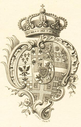 Das Wappen folgt inhaltlich und hinsichtlich der Zuordnung der einzelnen Felder in allen Details der bei seinem Großvater ausgeführten Beschreibung (s. o.). Im Gegensatz zu dem Exlibris seines Großvaters wird hier jedoch auf die Darstellung von Orden verzichtet, obwohl er ebenfalls Ritter des Ordens vom Goldenen Vlies, Großmeister des St. Ludwigs-Ordens, Großmeister des Konstantinsordens etc. war.