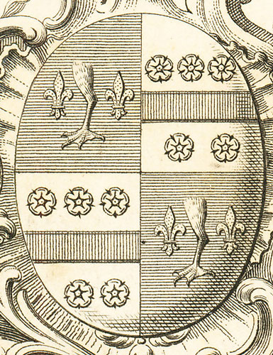 Wir sehen auf dem Kupferstich (65 x 70 mm) das Wappen der Familie