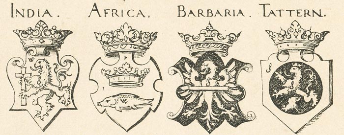 Besonders interessant ist die Listung eines Wappens BARBARIA für die Barbarei, goldener ("g") Adler in Schwarz, auf der Brust mit einer beiderseits abgeledigten Leiste belegt. Das ist nichts anderes als der Adler der deutschen Könige in invertierten Farben, quasi als Antithese zur Kulturnation, Barbarei eben, zusätzlich noch mit der kurzen Leiste belegt, was eine zusätzliche Minderung darstellt (vgl. die Verwendung von Einbrüchen etc.). Und bei weiteren Wappenschilden verweisen schon bereits die Namen in das Reich der Phantasie, Ausdruck einer Zeit, in der die Außengrenzen der bekannten Welt durch Entdecker durchbrochen wurden und man stets auf Integration des Unbekannten gefaßt sein mußte.