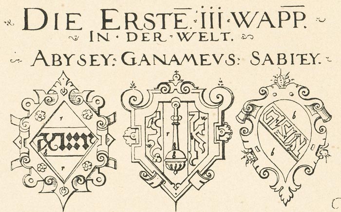 Auch bei Virgil Solis finden sich die "ersten Wappen in der Welt", "ABYSEY", in Rot ("r") ein mit mehreren hebräisch aussehenden Schriftzeichen belegter goldener ("g") Balken, GANAMEVS, in Silber ("w") ein roter ("r") , mit einer goldenen ("g"), gestielten Schelle belegter Pfahl, begleitet von zwei blauen ("b"), hebräisch aussehenden Schriftzeichen und "SABITEY", in Blau ("b") ein goldener ("g"), mit drei roten "r"), hebräisch aussehenden Schriftzeichen belegter Schrägbalken. "ABYSEY" und "SABITEY" finden sich bis auf marginale Unterschiede analog in einem süddeutschen Wappenbuch (BSB 392d) aus der 1. Hälfte des 16. Jh., dort wird dem mittleren Wappen allerdings der Name "BANANIAS" zugeordnet. Welcher dieser Phantasienamen zu welchem Phantasiewappen gehört, ist heute wie damals jedoch völlig irrelevant, wichtig ist die Botschaft einer inhärenten Struktur und Systematik, und entsprechend der Verwurzelung der christlich-abendländischen Kultur in der jüdischen Kultur verlegte man die Wurzeln des heraldischen Erbes ebenfalls in die jüdische Formensprache mit den Schriftzeichen. Inhalte und Namen sind austauschbar, das ordnende Element allein ist wichtig, denn heraldische Verzeichnisse waren zugleich ein Abbild der Ordnung in dieser Welt.