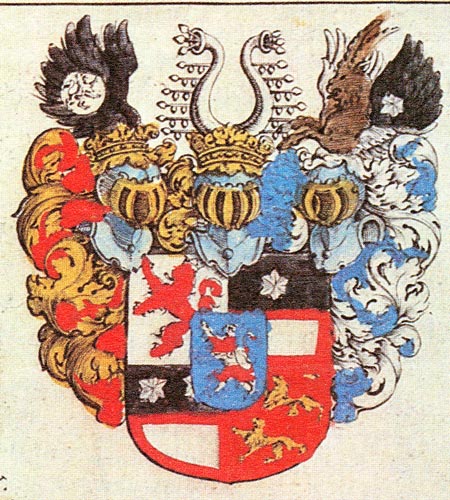Das landgräflich-hessische Wappen ist hier nicht korrekt wiedergegeben. Es müßte sein: Geviert mit Herzschild, Feld 1: Grafen von Katzenelnbogen, in Gold (hier falsch) ein roter Löwe, blau bewehrt und blau bekrönt, Feld 2: Grafen von Ziegenhain, schwarz-golden geteilt (hier falsch), oben ein silberner sechsstrahliger Stern, Feld 3: Grafen von Nidda, schwarz-golden geteilt (hier falsch), oben zwei achtstrahlige silberne Sterne, Feld 4: Grafen von Dietz, in Rot zwei goldene, blau bewehrte schreitende Löwen übereinander, Herzschild: Landgraf von Hessen (Stammwappen), in Blau ein silbern-rot mehrfach geteilter aufrechter Löwe, golden gekrönt und golden bewehrt. Dazu gehören folgende 3 Helme: Helm 1 (Mitte): Landgrafen von Hessen, auf dem gekrönten Helm zwei Büffelhörner, außen besteckt mit je 7 Lindenzweigen (auch als Kleestengel bezeichnet), Helm 2 (optisch links): Grafen von Katzenelnbogen, auf dem gekrönten Helm mit rot-goldenen Decken ein schwarzer Flug, beiderseits belegt mit einer wie der Schild tingierten Scheibe (hier ohne Tinkturen), Helm 3 (optisch rechts): Grafen von Ziegenhain, auf dem Helm mit hier abweichend blau-silbernen Decken ein springender Ziegenrumpf zwischen einem wie der Schild tingierten und mit je einem silbernen sechstrahligen Stern belegten Flug. Darunter befindet sich noch eine einfache Darstellung des Stammwappens mit rechts blau-silbernen und links rot-silbernen Decken.