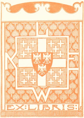 Abb. 12 schließlich zeigt ein Exlibris nur für seine Frau, dennoch mit einem Allianzwappen. Das aus dem Jahre 1892 stammende Blatt wurde von Wilhelm Behrens (16.2.1858-24.10.1904) angefertigt (Klischee, 120 x 82 mm, Gutenberg Nr. 15.216; Witte, Bibliographie 1, 57). Das Blatt ist stilistisch dem Neobarock verhaftet, der hier schon jenseits der Grenze zum Kitsch ist, insbesondere was die Strahlen-Aureole betrifft, die in ähnlicher Weise sonst nur barocke Heiligenfiguren umgibt, und was den auf dem Rücken liegenden Putto betrifft, der ist kitschiger als es der echte Barock gewagt hätte. Der Formensprache des Rokoko sind die einrahmenden Ornamente und sonstigen Zierformen entlehnt, deren verzerrte Formen hier mit der Symmetrie der Komposition kontrastieren. Der Künstler war 1883-1898 in Kassel an der Kunstgewerbeschule als Lehrer für Dekorationsmalerei tätig. Danach wechselte er an die Kunstgewerbeschule Nürnberg und lehrte dort von 1898 bis zu seinem Tod als Professor ornamentales Zeichnen. Im Laufe seines Berufslebens machte er eine gewisse Entwicklung durch, die mit dem Stil des Neobarocks begann und dann zunehmend den Beginn des Jugendstils in der Kunst nachvollzog. Er begann mit heraldischen Darstellungen, zeichnete zwischen 1892 und 1903 mehrere Exlibris, deren Einfassungen und Rahmen mit floralen Elementen schon seine Liebe zum Ornament anklingen lassen. Später ging er ganz zur figürlichen Malerei über.