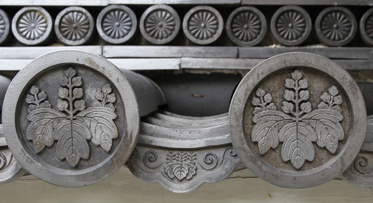 Burg Hikone, Umaya (Pferdeställe): Wappen der Familie Ii auf dem First-Endziegel.