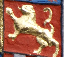 in Rot zwei goldene, schreitende, hersehende Löwen (Leoparden)