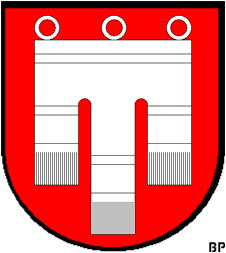 von Montfort-Tettnang, Montfort-Bregenz In Silber eine rote Kirchenfahne mit drei Hängeln und oben drei Trageringen. Helmzier ein infulartiger roter Beutelstand, die beiden Zipfel mit einer silbernen Kugel besteckt. Daraus wird später eine rote (silberne) Inful mit silbernern (roten) Verzierungen (Bordierungen). Var. Helmzier ein wachsender, rot gekleideter Mannesrumpf, auf dem Haupt eine rote Inful mit zwei silbernen Kugeln an den beiden Spitzen und abflatternden roten Bändern, var. ein wachsender Bischof mit rot-silberner Inful und einem Gewand, welches wie der Schild bez. ist, verzeichnet Nach Siebmacher. Nach der Züricher Wappenrolle. Scheiblersches Wappenbuch.