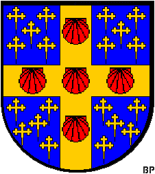 d'Argenteau Stammwappen In Blau ein mit 5 (1:3:1) roten Pilgermuscheln belegtes, goldenes, durchgehendes Kreuz, von 20 (4x 5(2:1:2)) goldenen Steckkreuzchen (widergekreuzten und fußgespitzten Kreuzchen) bewinkelt. Helmzier ein in den Schildfarben gekleideter Mannesrumpf mit rotem Priesterhut. (Nach: Loutsch) |